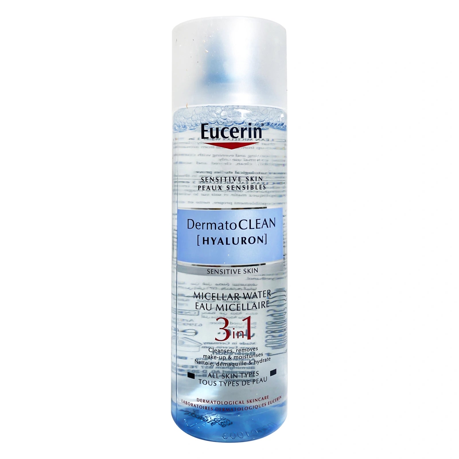Eucerin DermatoCLEAN 3 in 1 Micellar Cleansing Fluid is a refreshing, cleansing solution that: Removes all water-soluble eye and face make-up.Helps the skin to breathe better.