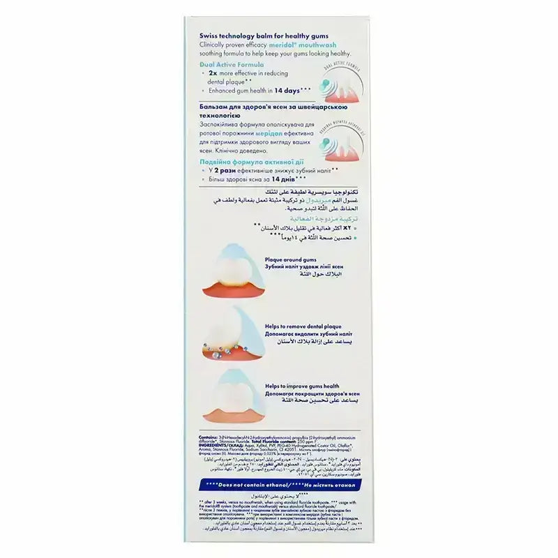 Meridol Mouthwash has a proven, dual-action formula for the daily care of healthy teeth and gums.Meridol mouthwash reduces plaque, eliminates bacteria buildup, and reduces re-formation.