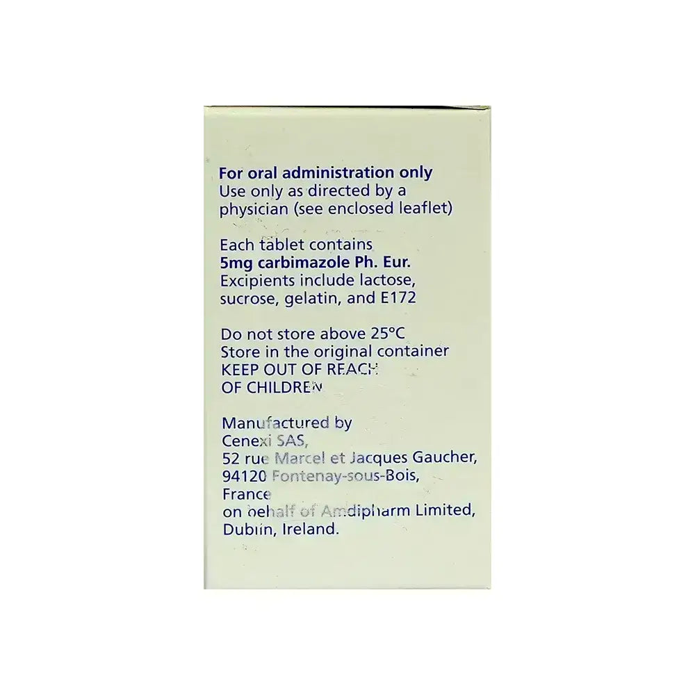 Neomercazole 5mg tablets are a medication used to treat hyperthyroidism.The tablets contain the active ingredient Carbimazole and belong to the class of anti-hyperthyroidism agents.