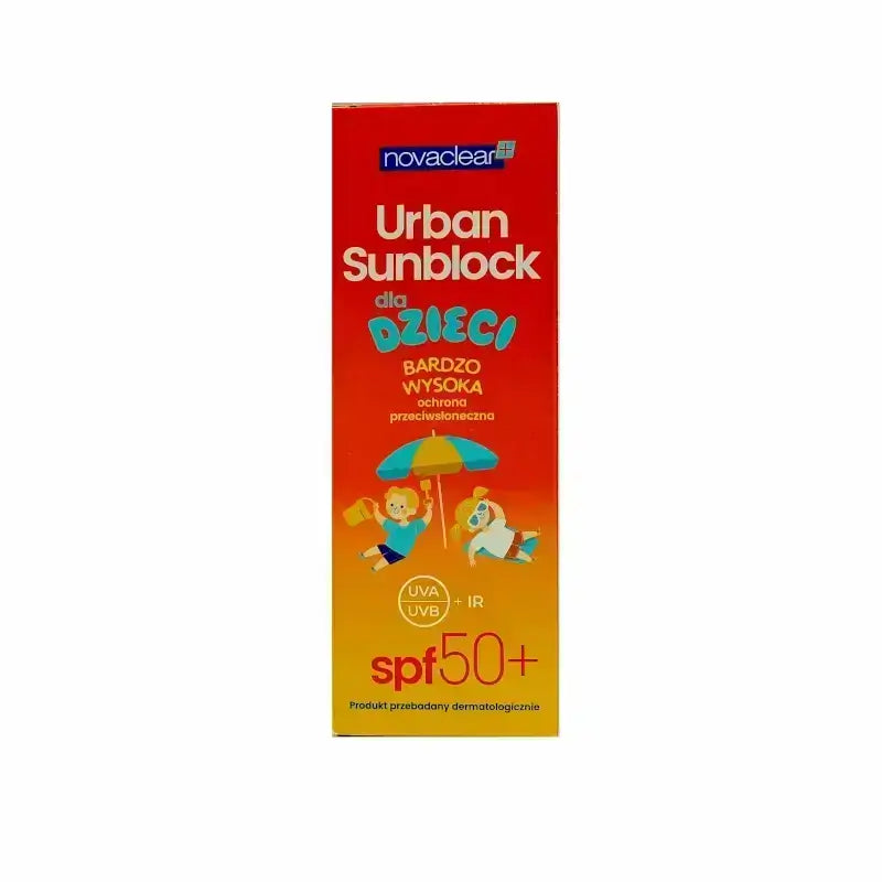 - Novaclear Urban Sunblock Kids SPF 50+ Cream is a highly protective sunblock cream that shields the skin from harmful UVA, UVB, and IR rays. - The sunblock cream formula includes Aloe Vera Extract and Hydromanil which soothe and calm the skin.