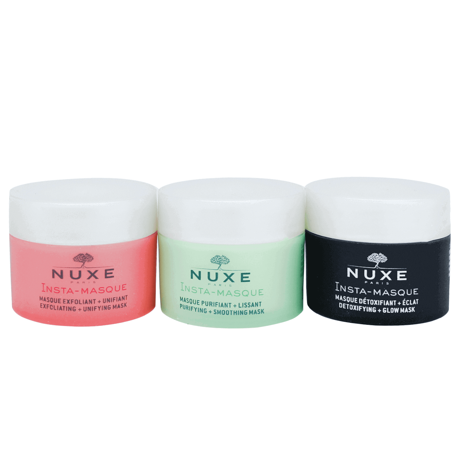 a set of three face masks with ultra-sensory textures and deliciously addictive scents that restore the complexion in just 2 minutes. To achieve ultimate radiance and freshness, try the NUXE Insta-Masque Detoxifying + Glow Mask; to correct enlarged pores and excess shine, try this NUXE Insta-Masque Purifying + Smoothing Mask; finally, for a softer and finer skin texture, try the NUXE Insta-Masque Exfoliating + Unifying Mask. Use each mask separately for specific skin issues or combine them as desired for a relaxing home spa experience.