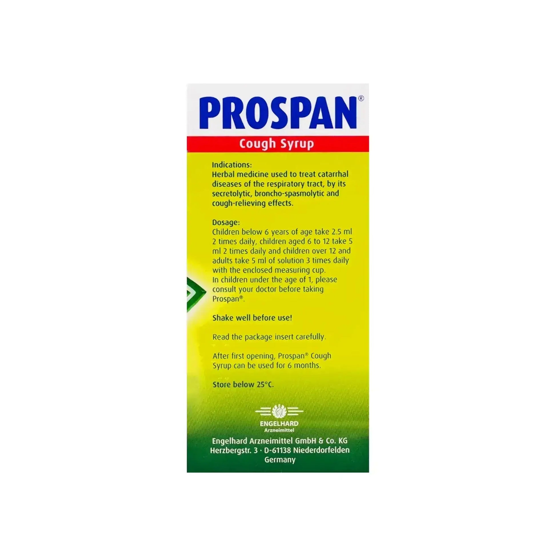 Prospan cough syrup is a natural formula rich in botanical extracts known for their importance in improving and supporting the functions of the respiratory system and bronchial tubes and treating cough. Prospan syrup consists of dry ivy leaf extract that expands the bronchi to improve breathing and treat cough by dissolving phlegm and getting rid of mucous secretions in the airways. Prospan syrup is ideal for relieving symptoms of colds and flu, As it does not cause drowsiness. Prospan syrup is suitable for use by all family members as it is safe for adults and children.Active ingredients: