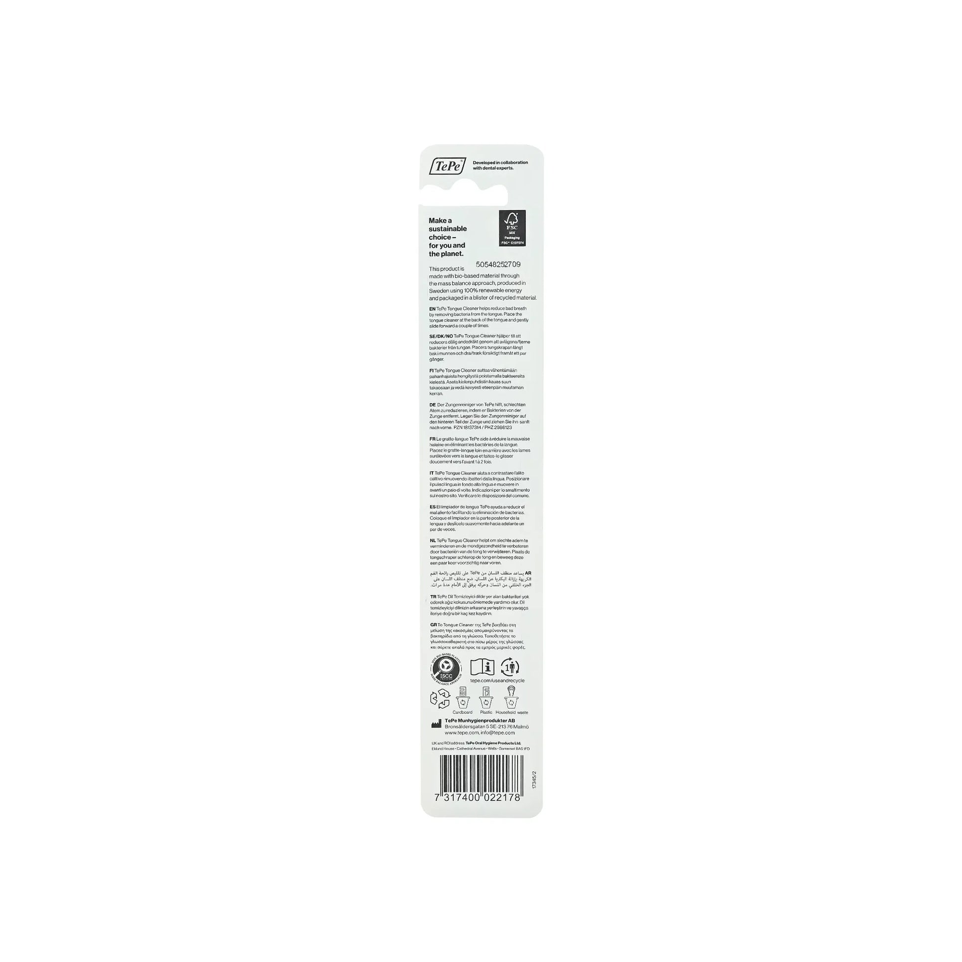 The Tepe Tongue Cleaner (Model 17345/2) is designed to clean the tongue and remove bacteria that contribute to bad odors.It features a 3-layer design that ensures safe and effective cleaning, while the slim handle allows for easy access to all areas of the tongue, reducing the gag reflex.