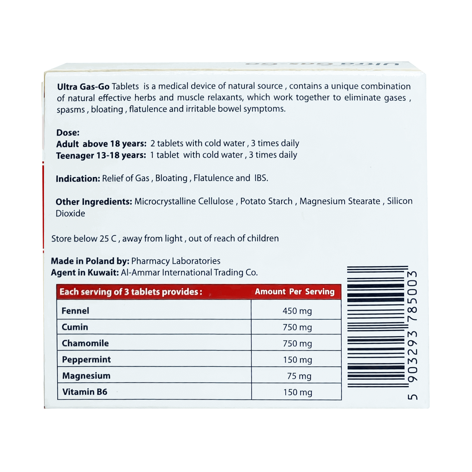 Ultra Gas Go Tabs 45 tablets are a food supplement against flatulence and bloating, contains a unique combination of natural effective herbs and muscle relaxants (Fennel, Peppermint, Cumin, Chamomile, Magnesium, Vitamin B6), which work together to eliminate gases, spasms, bloating, flatulence and irritable bowel symptoms.