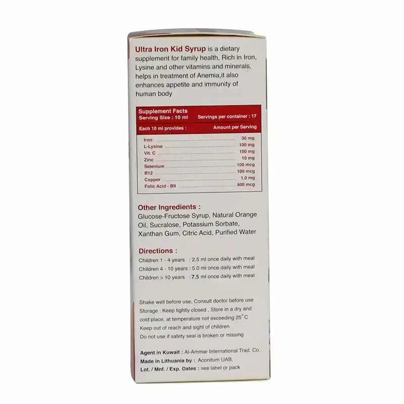 Ultra Iron Kid Syrup is a dietary supplement rich in iron, lysine, and other vitamins and minerals that help treat anemia, enhance appetite and strengthen the body's immunity.It contains a unique combination of 8 hematogenic factors that work together to stimulate the formation of red blood cells and hemoglobin.